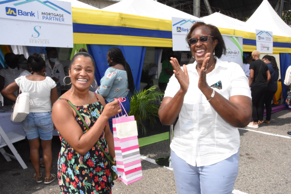 - Ruth Fraser (right), realtor at Stroll Properties Services, presents Melissa Blake Bygrave with a prize, during the JN Bank Open House held at the JN Bank Half Way Tree location on Sunday, July 24. Patrons who attended the event were able to benefit from discounts of up to 20% on property valuations and surveyor reports.