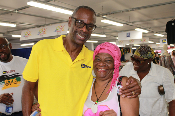 - Emile Spence (left), former Chief Representative Officer, JN Bank Canada Representative Office, presents a patron with JN Bank memorabilia at the JAMTRINBAGO Festival held in August last year.