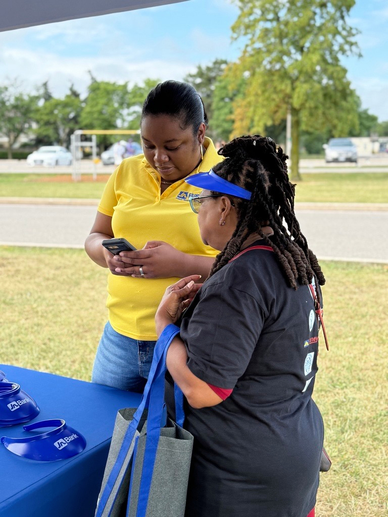 Sabriena Simpson-Blake, member service representative at the JN Bank Canada Representative Office, assists a patron at the Friends of Fortis/ Dance Immersion 5K Walk/Run, held at the Chinguacousy Park in Brampton, Ontario, on August 17.
